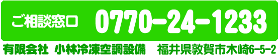 福井県敦賀市の有限会社小林冷凍空調設備では、個人様・法人様を問わず空調設備・エアコン・冷蔵庫・冷凍庫・活魚水槽・ボイラーなどの販売・施工・修理・点検をしている会社です。